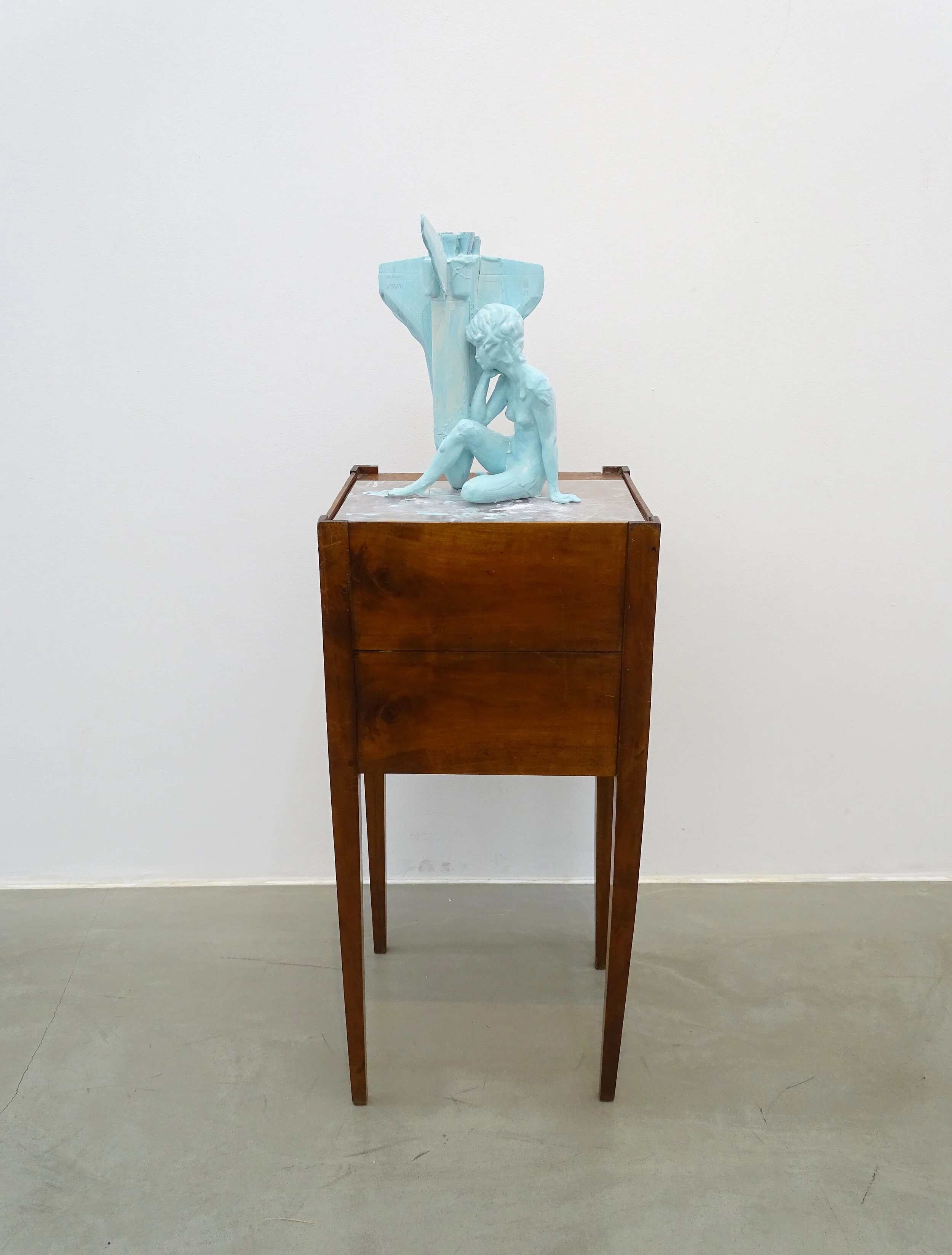 This is a piece from the "Girl with Shuttle - series" I started in 2021. Those found objects are painted with iceblue latex, powdered and placed on an old Biedermeier furniture.